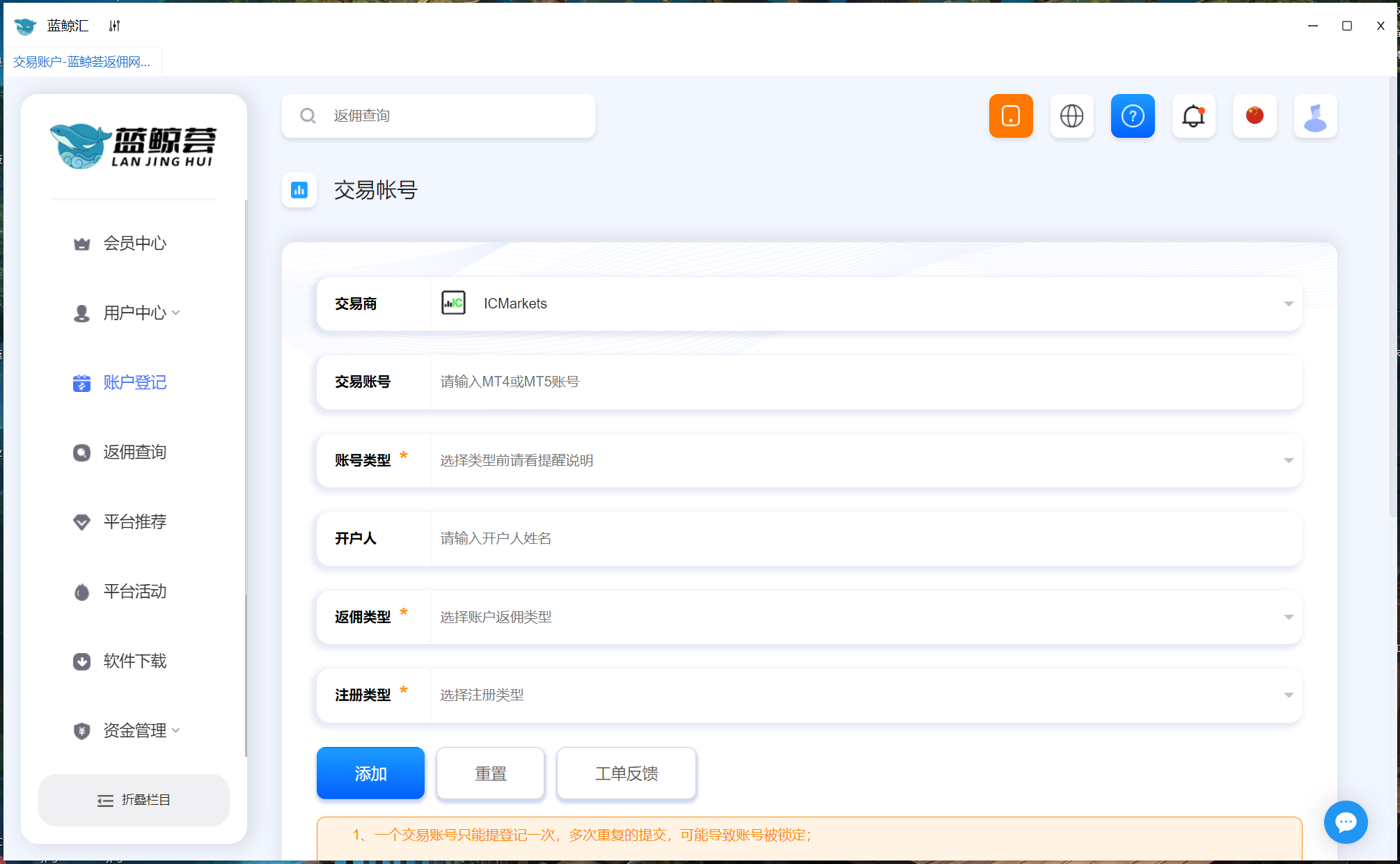 如何查找忠诚度返佣界面?首先登录到蓝鲸荟返佣网后台首页:https://lanjingfx.com/user/右上角头像下拉框有个注册会员点一下可跳转到忠诚度会员等级页面。进入该页面详细看下不同等级的