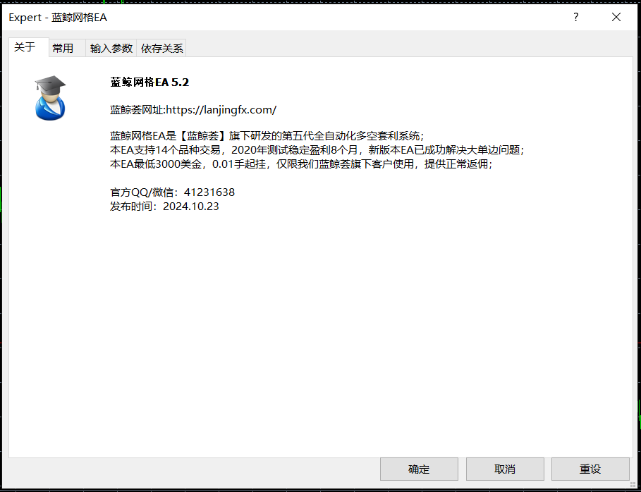现在我们决定将它投放市场,凡是在我们EX新代理名下开户的客户,送蓝鲸网格EA一个,永久使用,需绑定MT4账号。